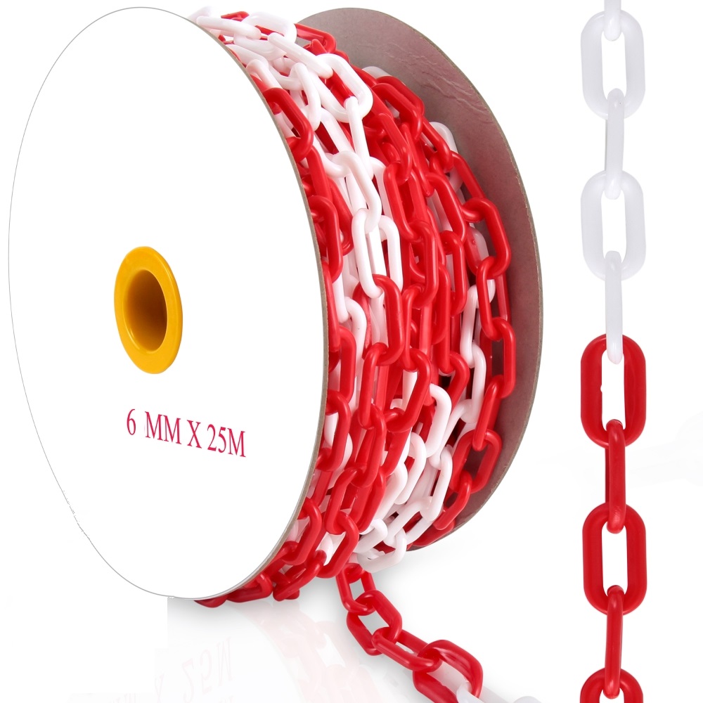 Высококачественная пластиковая оградительная цепь и карабин сигнального красно-белого цвета. Диаметр звена: 6 мм, бухта: 25 м.